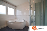 Une vaste salle de bain avec cabine de douche et baignoire balnéo jouxte une buanderie.